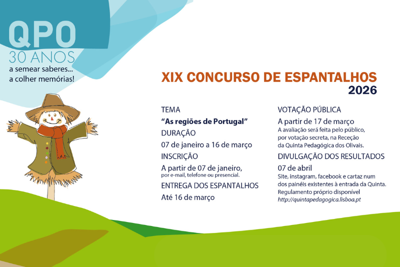 No ano em que assinalamos os 30 anos da Quinta Pedagógica dos Olivais, com três décadas dedicadas à educação e ao contacto com o mundo rural e à valorização das tradições, este concurso tem um sabor especial: desafiamos as escolas a explorar a riqueza cultural e natural de Portugal, dando forma a espantalhos que contem histórias, revelem identidades locais e celebrem o nosso património.